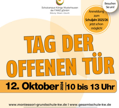 Unsere Montessori Grundschule mit integriertem Hort und unsere Gesamtschule mit gymnasialer Oberstufe laden Sie und Ihre Kinder herzlich ein, uns auf unserem Schulcampus in Königs Wusterhausen zu besuchen. Die Teams von Grundschule und Hort erklären die Besonderheiten der Montessori-Pädagogik in Kombination mit dem Konzept der „Bewegten Schule“. Unser Team der Gesamtschule informiert über alles Wichtige rund um den Übergang in die 7. Klasse und den Wechsel in die gymnasiale Oberstufe (Klasse 11).